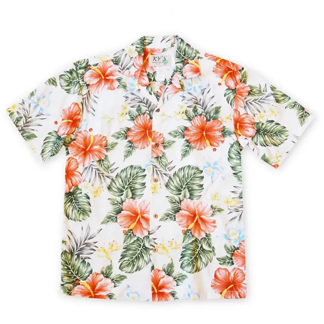 Set against a crisp white background, this lightweight cotton shirt offers breathability and comfort, making it perfect for warm days and tropical getaways. Whether you're strolling along the beach or enjoying a casual night out, the Ke‘e Hawaiian Cotton Shirt brings effortless aloha style to any occasion.