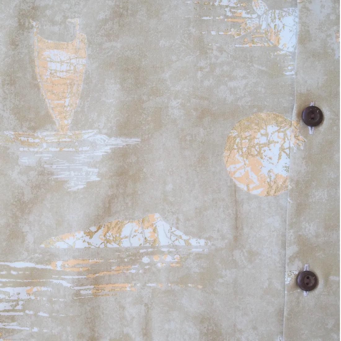 Earthy, bold, and full of aloha—the Kilauea Tan Hawaiian Shirt brings the spirit of the islands to life in warm, natural tones. This striking design features Hawai‘i's iconic imagery: an erupting volcano, outrigger canoe, sea turtle, surfer, palm trees, and moon—all set against a sandy tan background that echoes sun-drenched landscapes and timeless island style.