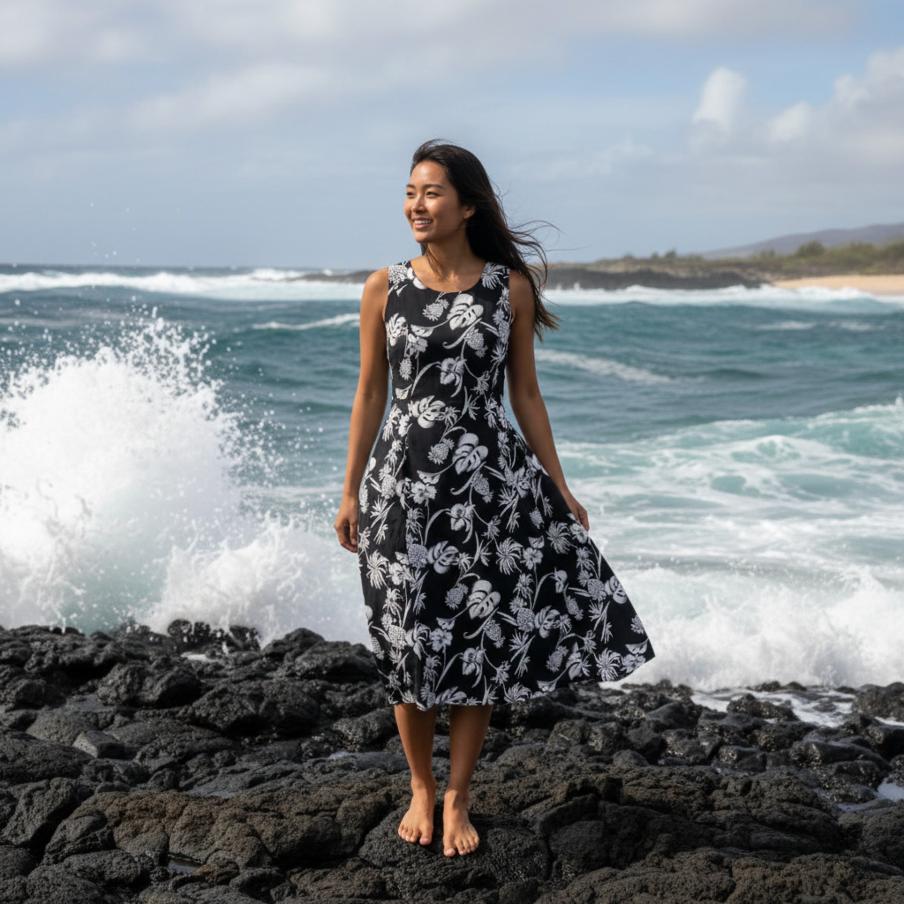 Step into a tropical dream with the Darling Hawaiian Long Dress from our Pineapple Paradise Collection. This exquisite dress, drenched in the rich hues of black, is adorned with a stunning design featuring pineapples, orchid flowers, and monstera leaves in a striking off-white contrast. The soft scoop neckline introduces a refined elegance, effortlessly complementing the adjustable back-tie waist detail that ensures a personalized, flattering fit. With its timeless midi silhouette, this dress promises a chic, enduring appeal.